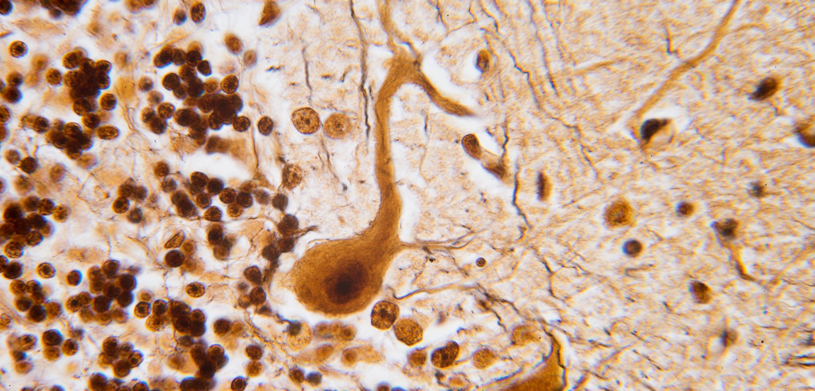 Giant motorneuron of the Spinal Cord, trichrome stain. (TM: 100x, picture taken with an Olympus DPlan 10/0.25 on Sony A7ii)Giant motorneuron of the Spinal Cord, trichrome stain. (TM: 400x, picture taken with a Zeiss F40/0.8 on Sony A7ii)Nissl bodies of a motorneuron stained with Nissl stain. These are rough endoplasmic reticulum and site of protein synthesis. Annotated version here. (TM: 630x, picture taken with a Zeiss Planapo 63/1.4 Oil on Sony A7ii)Giant pyramidal cells of the Cerebral Cortex. (TM: 630x, picture taken with a Zeiss Planapo 63/1.4 Oil on Sony A7ii)Cerebellum with silver impregnation. The layer of Purkinje cells at the border of the molecular layer and granular cell layer can be seen. (TM: 100x, picture taken with a Nikon Plan Apo 10/0.4 on Sony A7ii)Purkinje cell with dendrites extending into the outer molecular layer and the fine axon into the granular cell layer that is hard to observe. Annotated version here. (TM: 630x, picture taken with a Zeiss Planapo 63/1.4 Oil on Sony A7ii)Spinal Cord staining for the neuro-fibril. (TM: 630x, picture taken with a Zeiss Planapo 63/1.4 Oil on Sony A7ii)