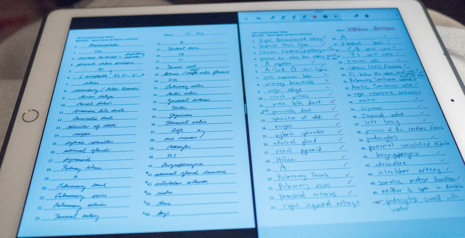 One feature of the iPad Pro I took advantage of is the split screen mode. Last semester on the same day of my final lab practical I took a trip by plane. Before I left campus, I used the school Xerox machine to scan the answer key and the students’ answer sheets into PDF. I uploaded these onto iCloud and then imported the answer key PDF into Adobe acrobat and the students’ answer sheets PDF into PDF Expert. The following picture showed how I graded the exams on the flight: Answer key in Acrobat on the left, students’ answer sheets on the right. It worked like a charm.