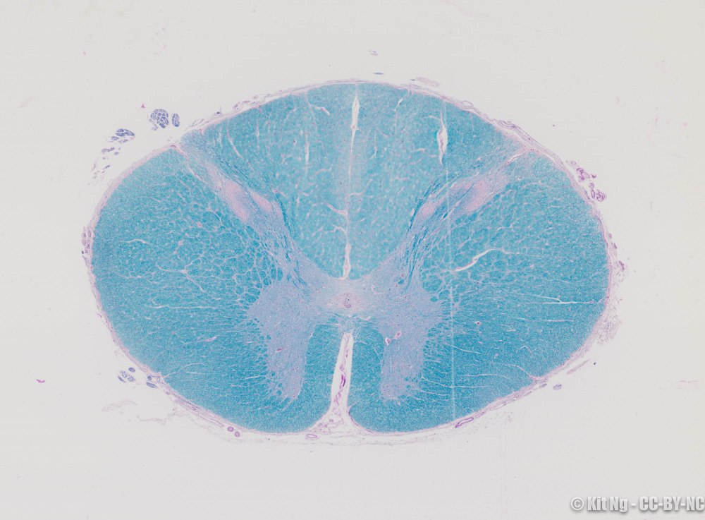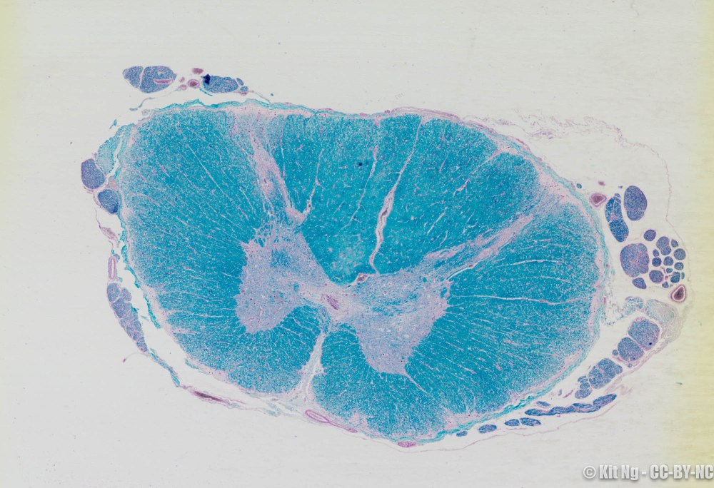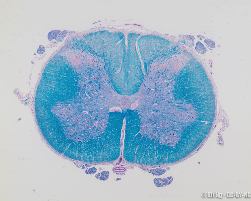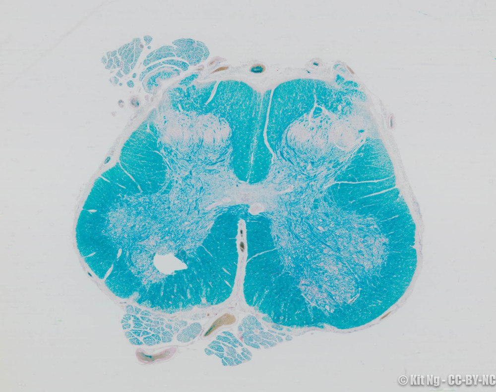 The cross section images of spinal cord from different regions show that the white and gray matter vary. Below are pictures from the 4 regions of the spinal cord.
