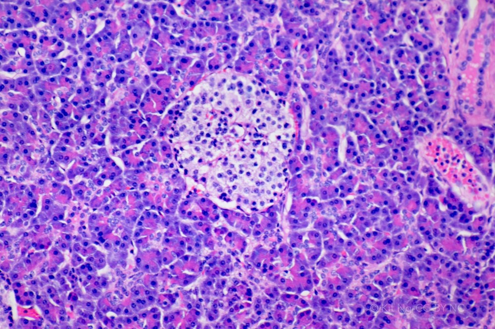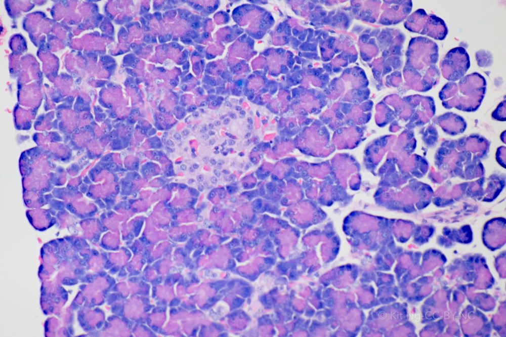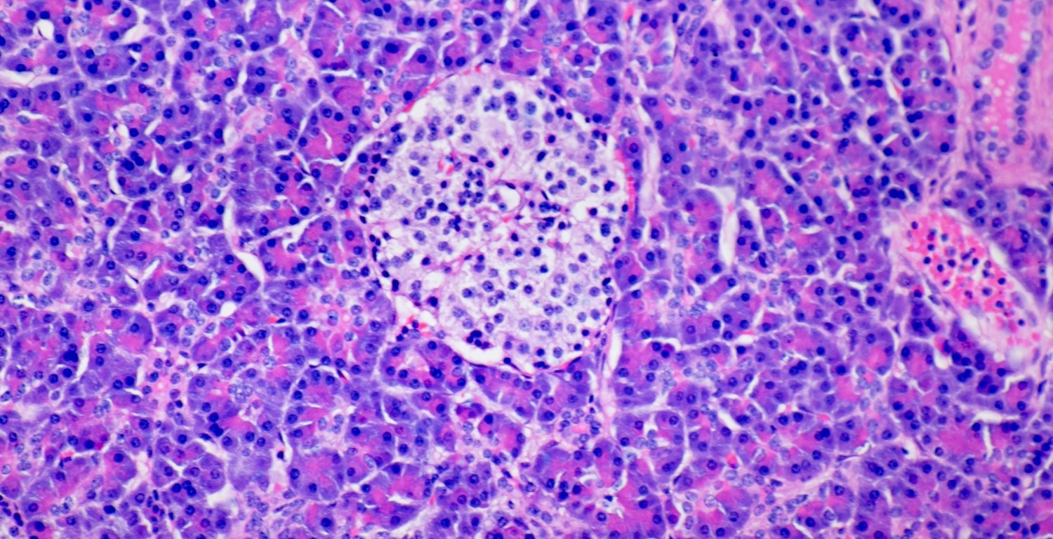 The pancreas is a retroperitoneal organ located behind the stomach. The organ is organized into lobes. The relationship between the pancreas and other organs can be viewed in the model here. Microscopically the organ has two parts – the endocrine part consists of the Islets of Langerhans, and the exocrine part consists of the acini.