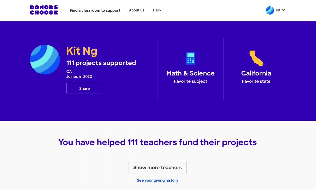 The organization also receive a 96+ out of 100 on Charity Navigator and an A+ on Charitywatch. I highly recommend giving to the teachers listed in this organization!