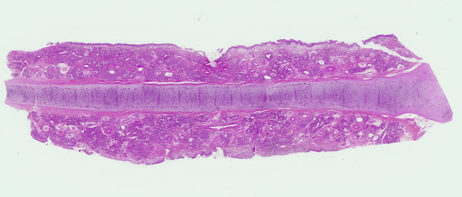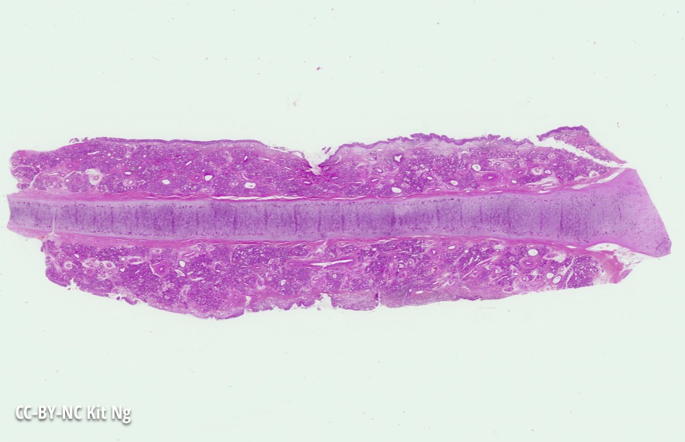 Low magnification picture showing the human nasal septum. The hyaline cartilage forming the septum can be seen clearly at this magnification.
