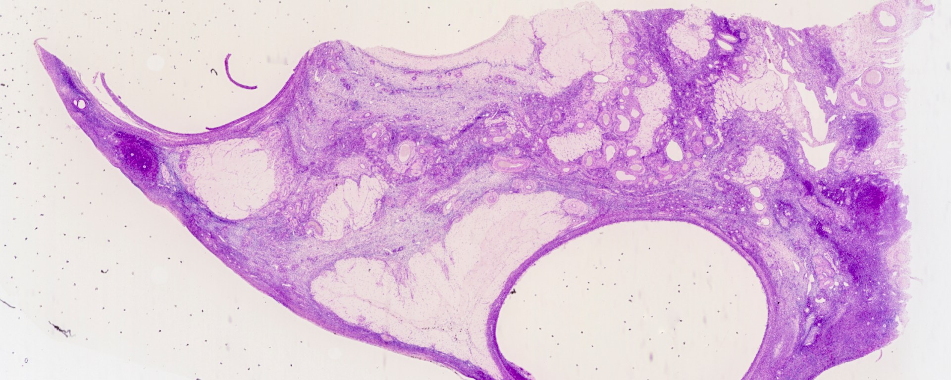 If no implantation occurs or after the placenta is established, the corpus luteum would undergo involution and become a mass of connective tissue known as corpus albicans. Due to the activity of the macrophages, they will eventually become acellular scars, and some will disappear over time. Three of the corpus albicantes are pointed out in this picture. The biggest white-colored structure is an ovarian cyst.