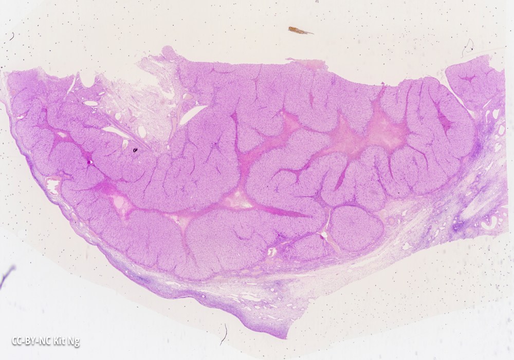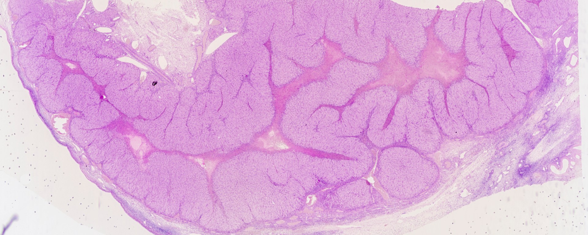 After ovulation, the remaining follicular cells (both theca and granular cells) transform into a temporary endocrine structure called the corpus luteum (yellow body). It produces progesterone that maintains the endometrium for implantation of the blastocyst. This picture shows a corpus luteum that is moving toward degeneration.