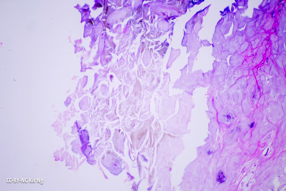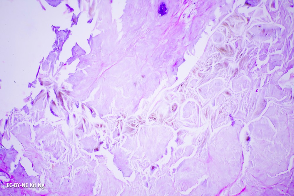 The gout crystals, formed from uric acid, can be seen under human skin in this specimen.