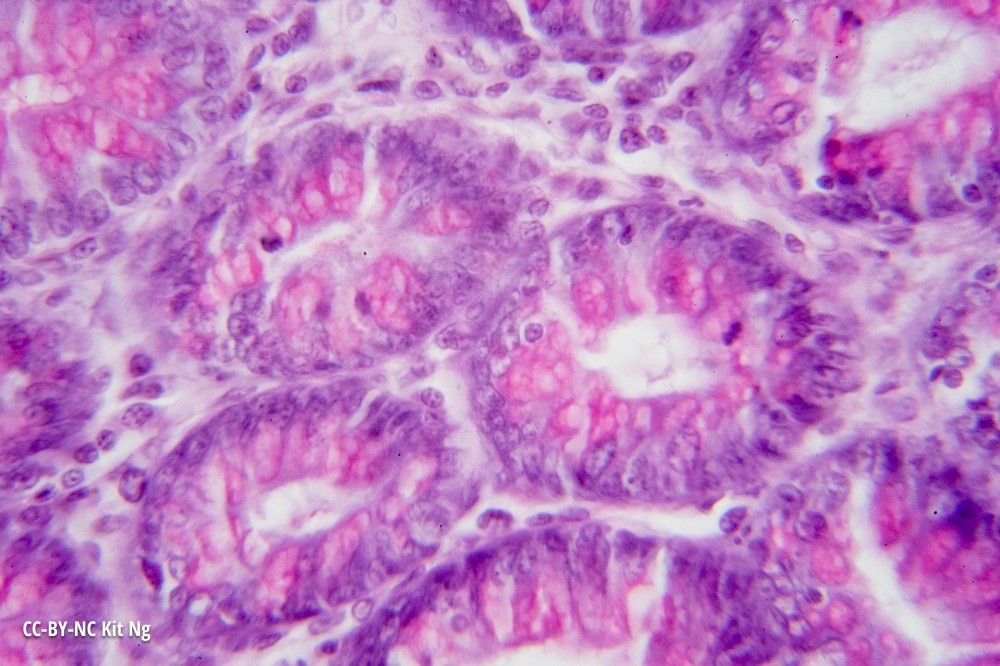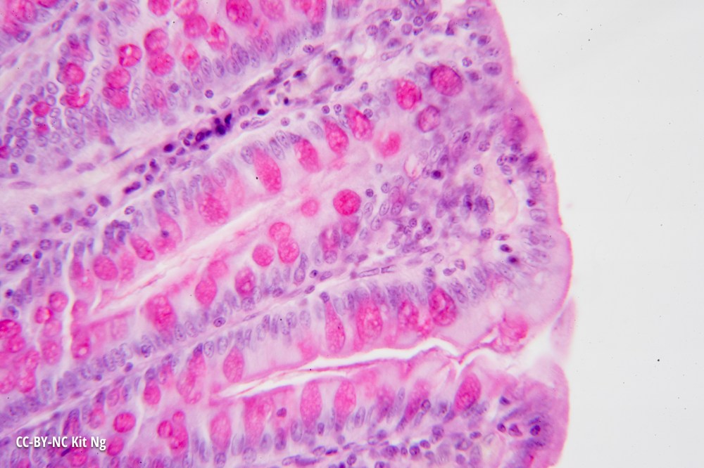 The large intestine absorbs water, electrolytes, and nutrients that are metabolized by the colonic bacteria, such as vitamin K. The remaining substance is mixed with mucus, produced by the numerous goblet cells in the colon, and becomes feces. The following picture stains specifically for mucus-producing cells.
