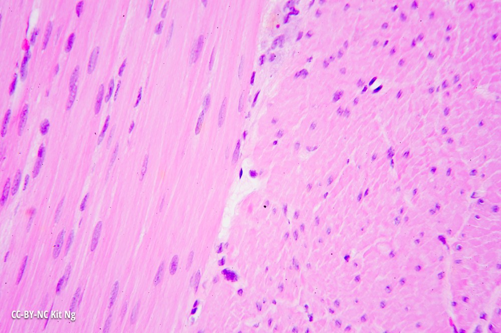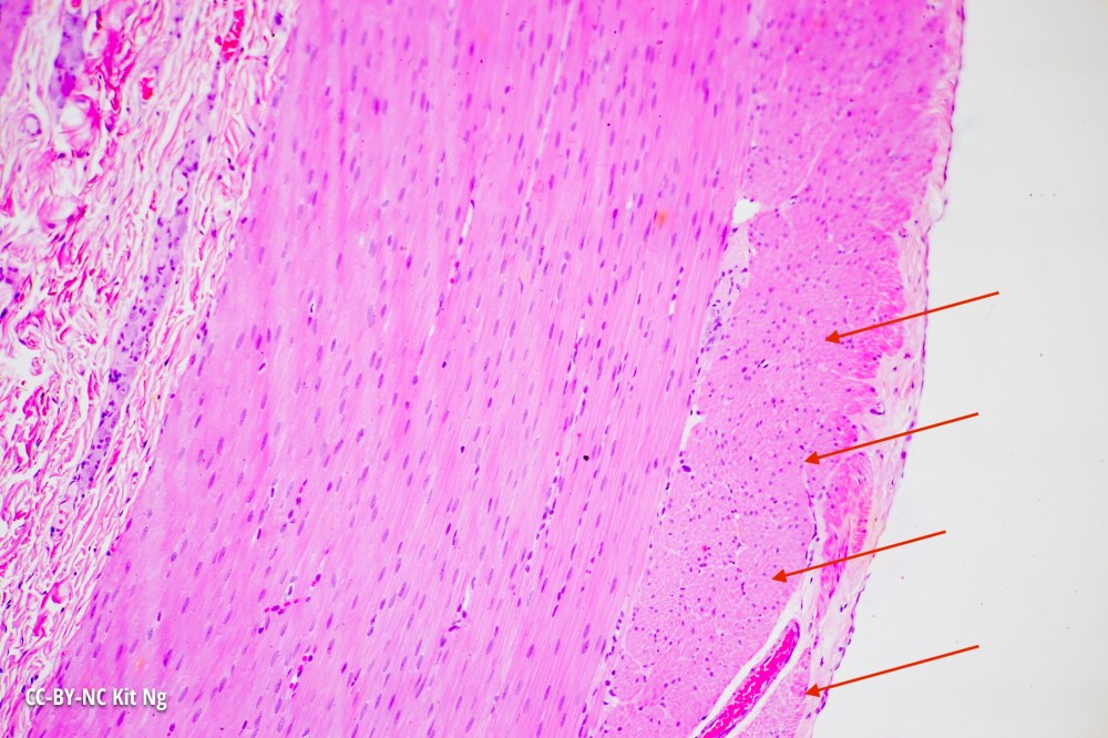 The large intestine is the penultimate portion of the digestive tract, between the small intestine and the rectum. The muscularis externa layer continues to separate into the circular and the longitudinal layer, with the exception that the longitudinal layer forming a muscular ribbon known as the teniae coli (at the pointers).